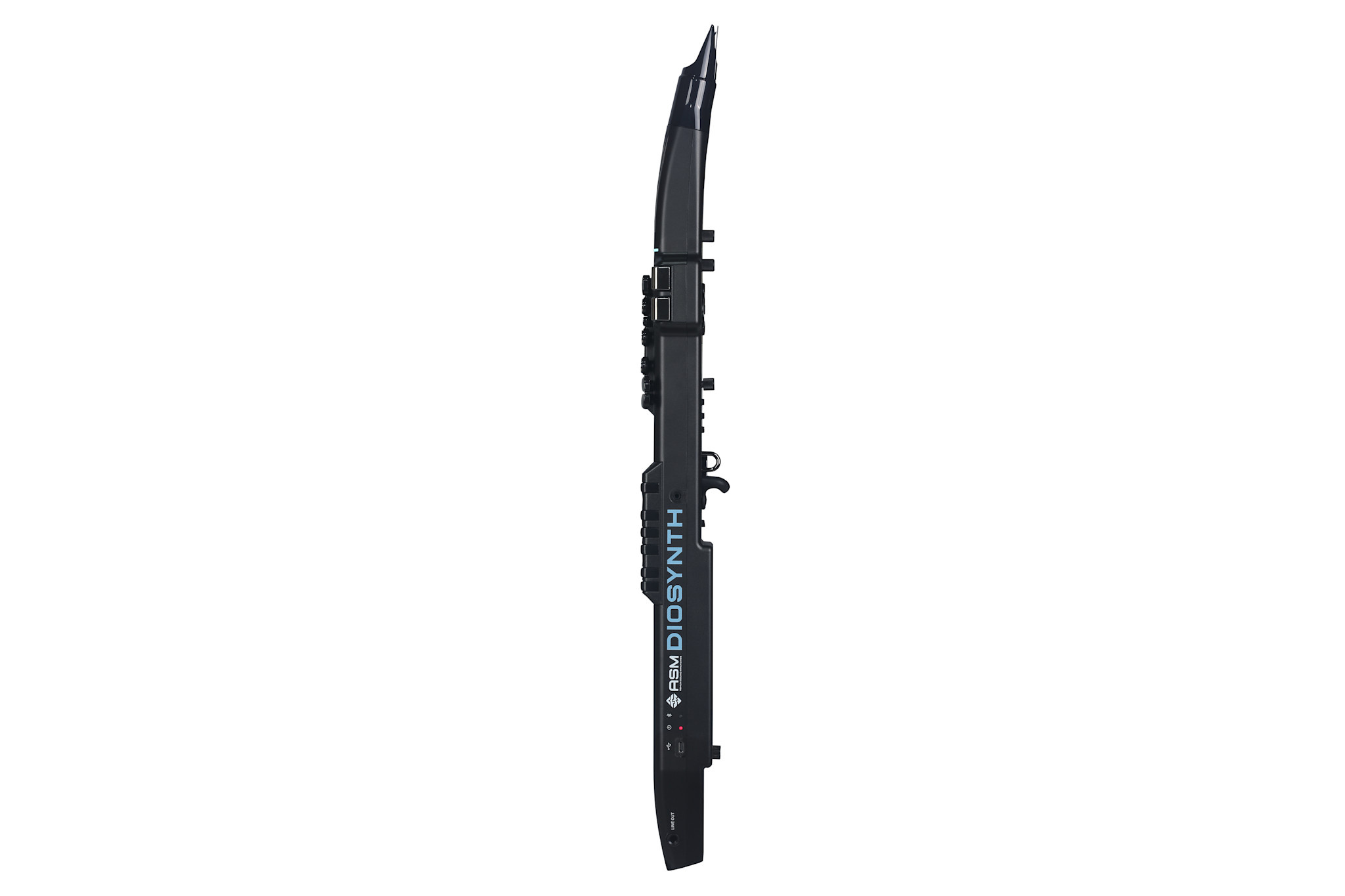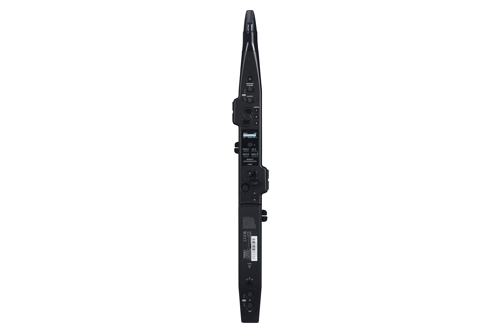 CONTROLS: Breath force sensor, Reed Bite sensor, 4 x Octave buttons (9-octave range), X/Y joystick, Control panel with clickable encoder and Mode buttons (Transpose, Favorites, Setup, Save, Sound/Edit), Assignable buttons (3), Pressure-sensitive buttons (2), separate volume controls (Speaker/Phones and Output), Gyro sensor