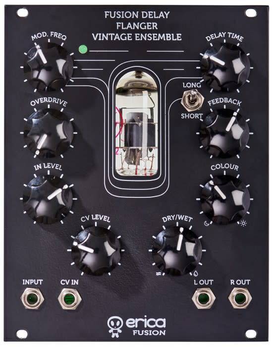 Erica Synths Fusion Delay/Flanger/Vintage Ensemble module is distinct multifunctional analogue effects module that combines BBD chip based effects with an adjustable tube overdrive in the delay output and feedback path for extra thickness of sound.
