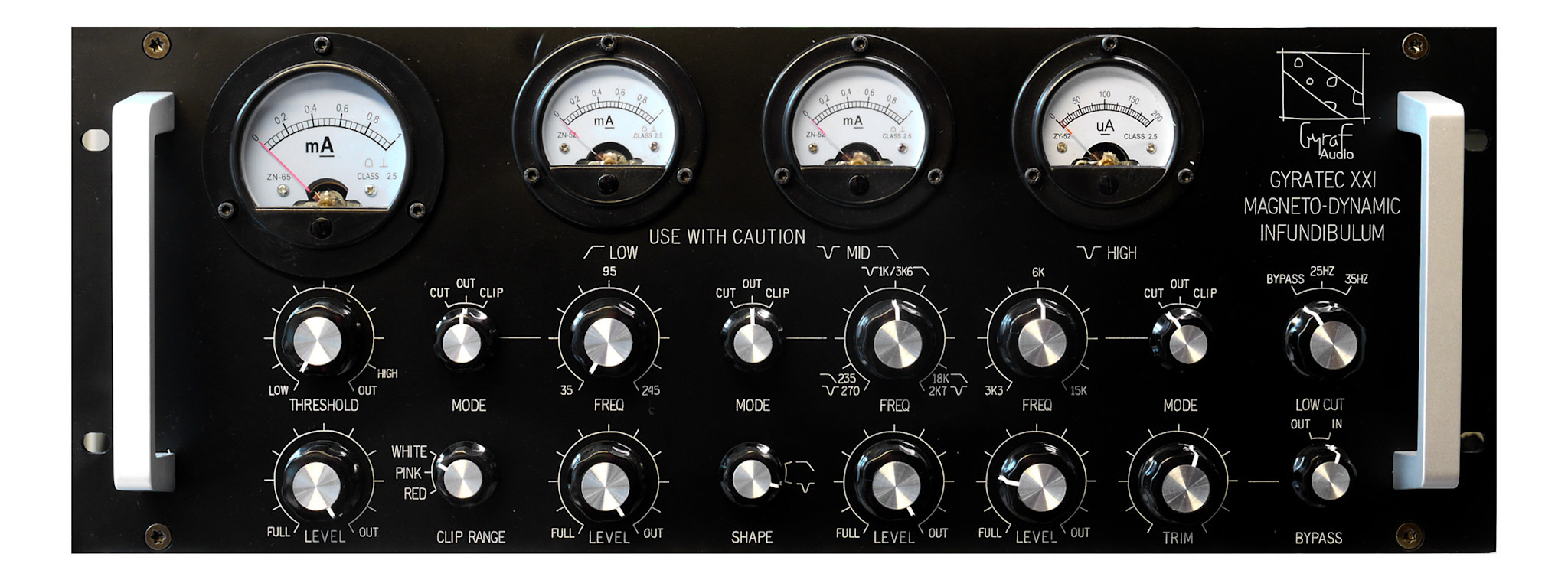 - Low Freq.: 35 - 245 Hz, Threshold, Level, Cut/Bypass/Clip
