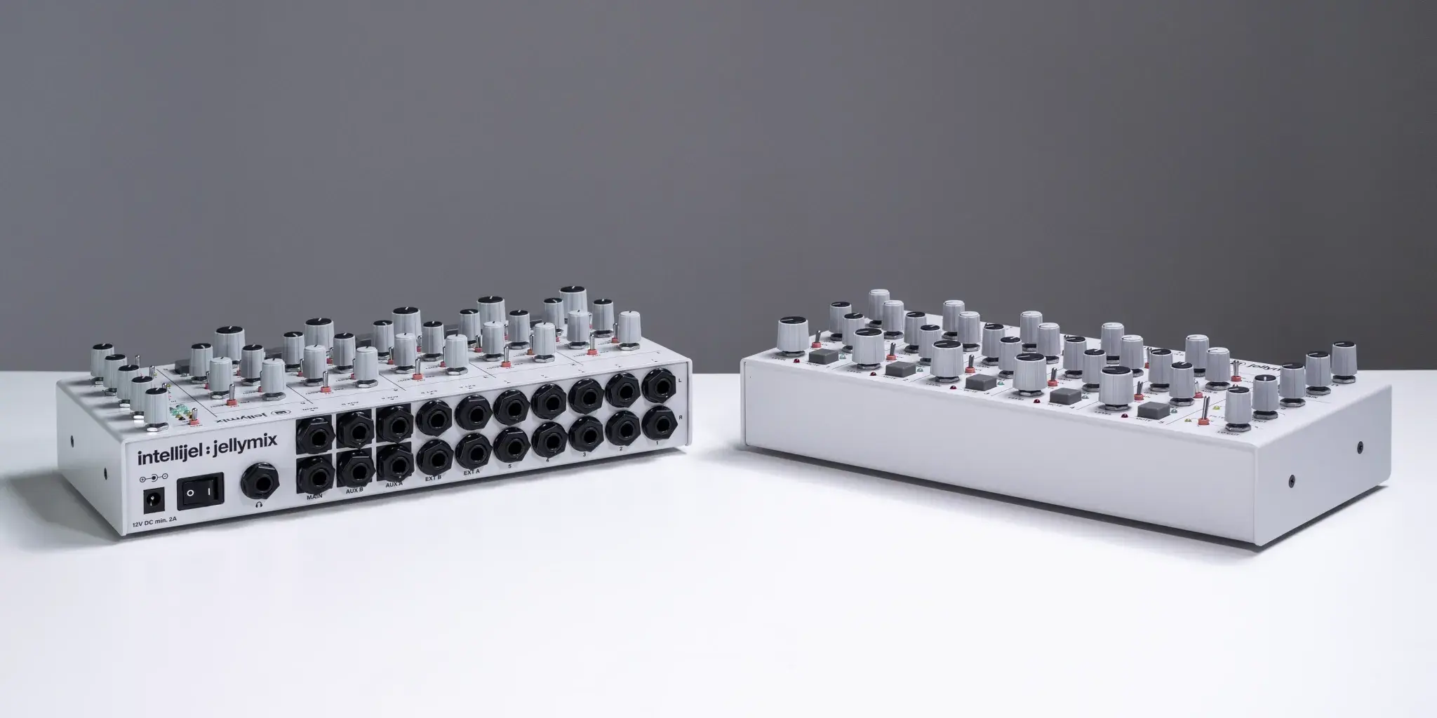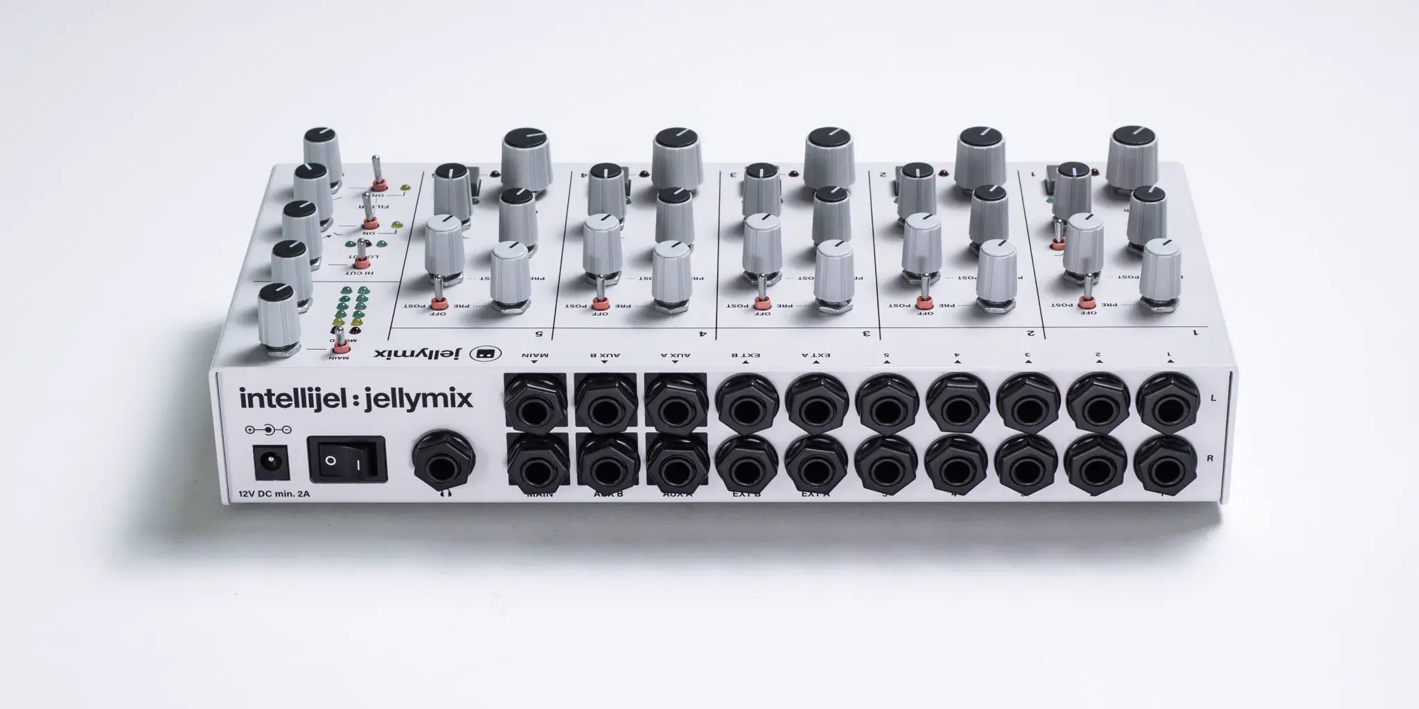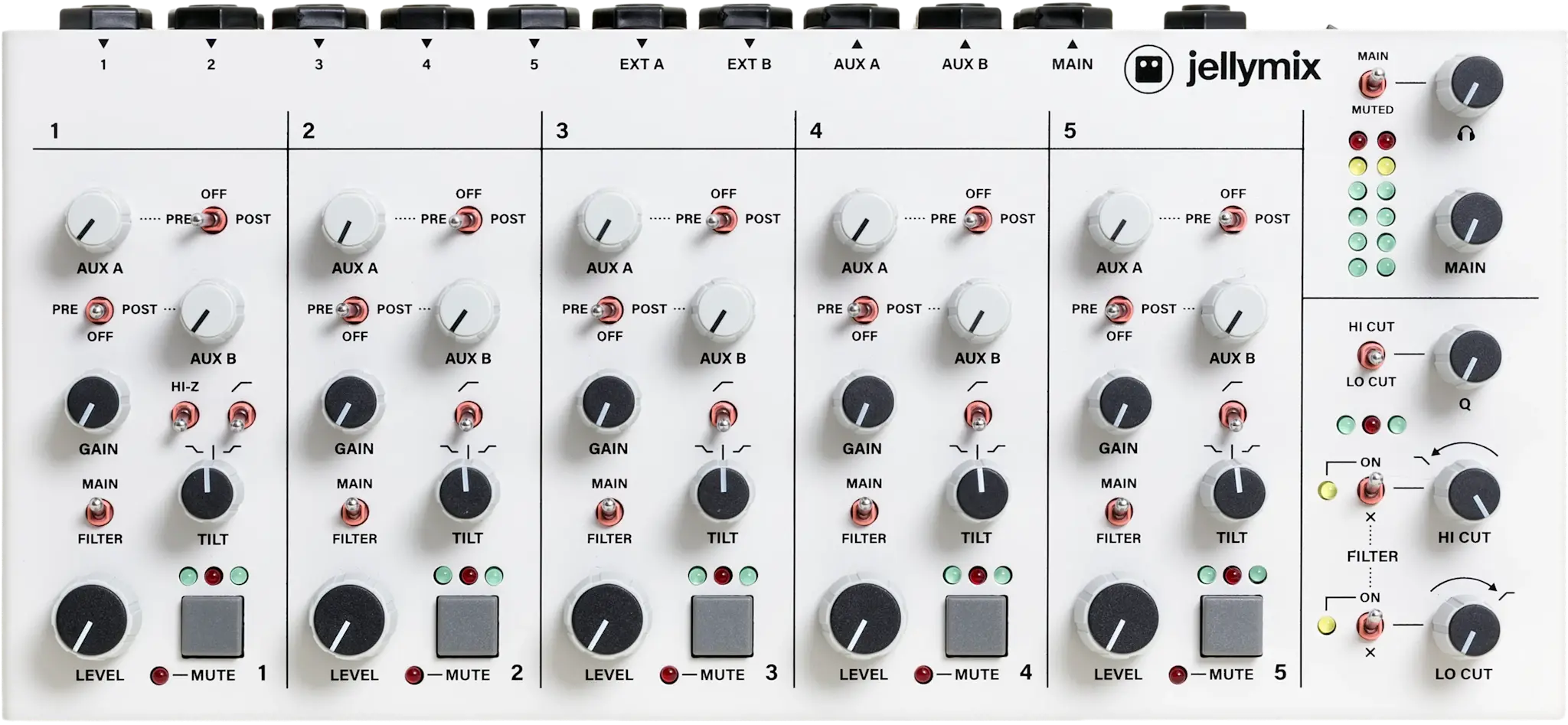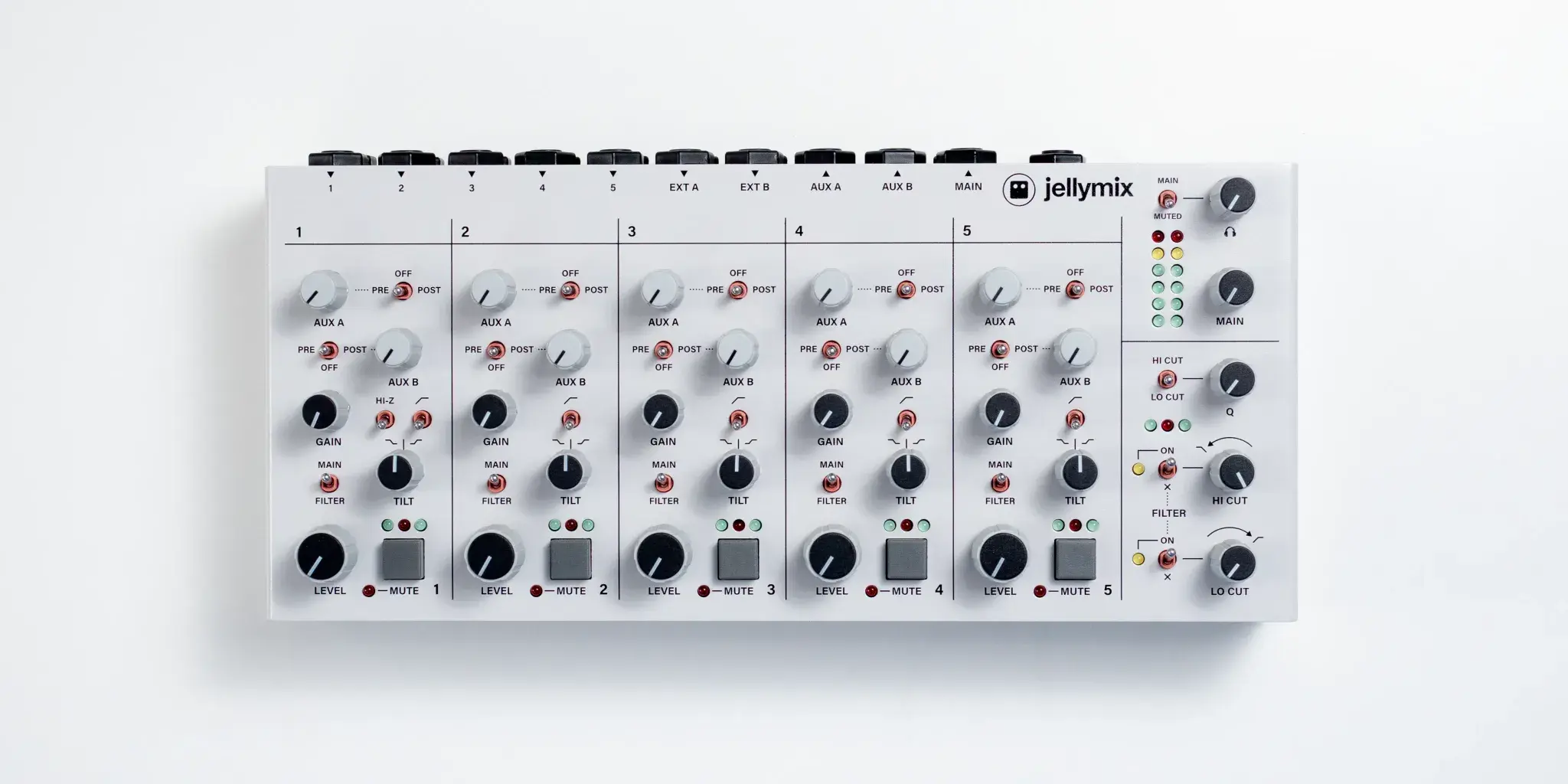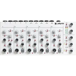Jellymix is a compact stereo performance mixer designed for electronic musicians. Connect your favourite synths, drum machines, modules, and grooveboxes to the five stereo input channels. Shape your sounds live with channel EQ, the dual stereo resonant filters, and stereo effects on the two stereo AUX busses. The tactile and inviting interface of Jellymix is perfect for knob twiddling, switch flicking, and/or button pushing your way to new sonic joys and dubby dreams; live on stage, your living room, or in the studio.
