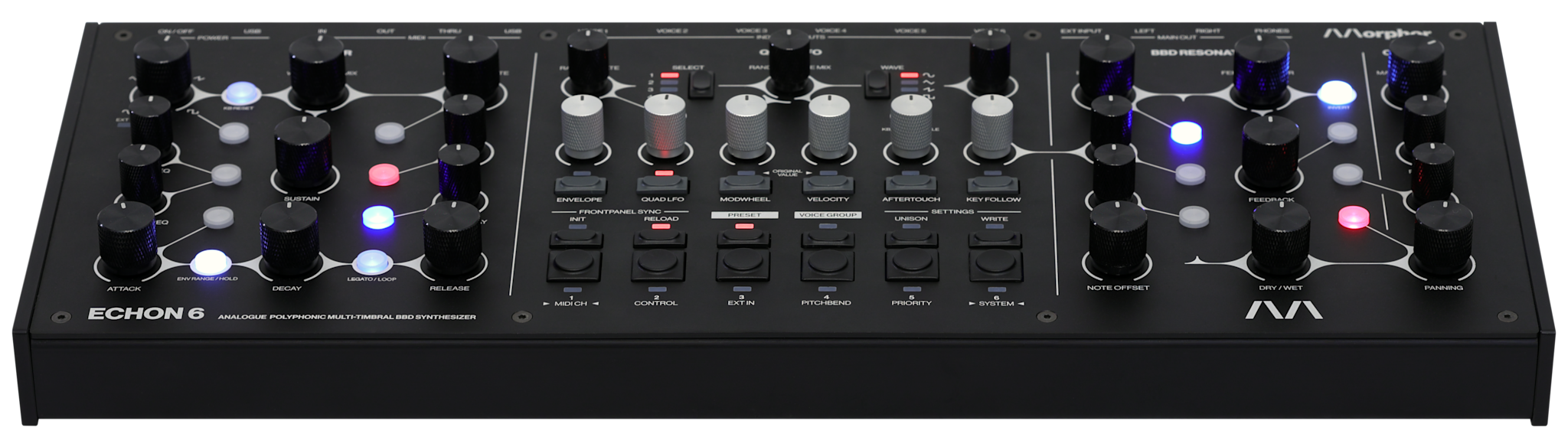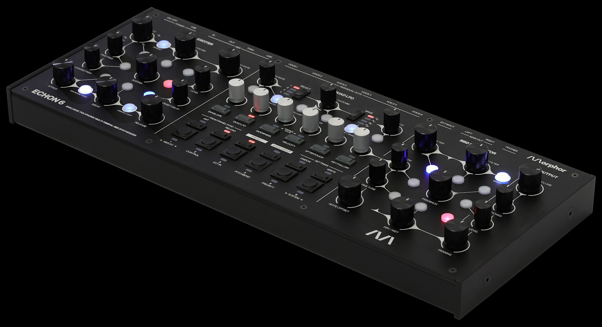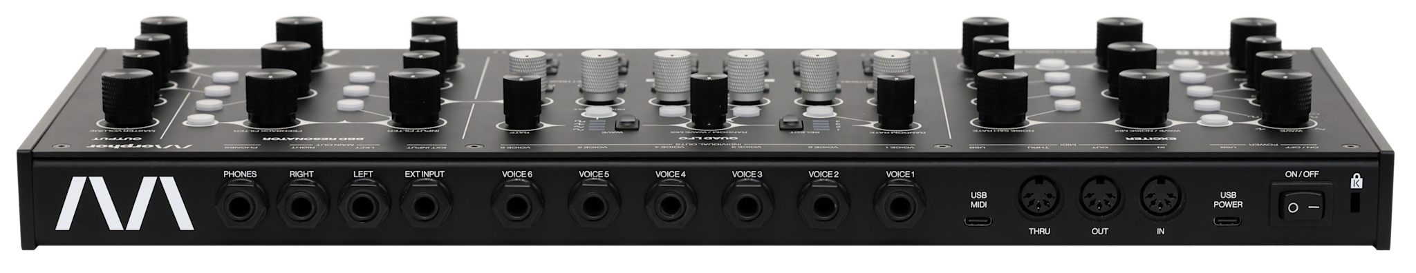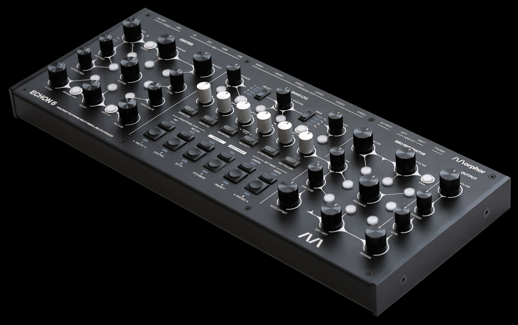 Its voice grouping and unison modes push ECHON 6 beyond the traditional polyphonic configuration into layered, multi-timbral and personally optimised setups. With its six independent stereo voice outputs, full MIDI control, and a rugged aluminum enclosure ready for tabletop, 19″ rack, or VESA mounting, ECHON 6 is built for both stage and studio. It is a fully tactile instrument — no display, no menus, no distractions — inviting musicians to play, perform, and explore sound through pure hands-on control.