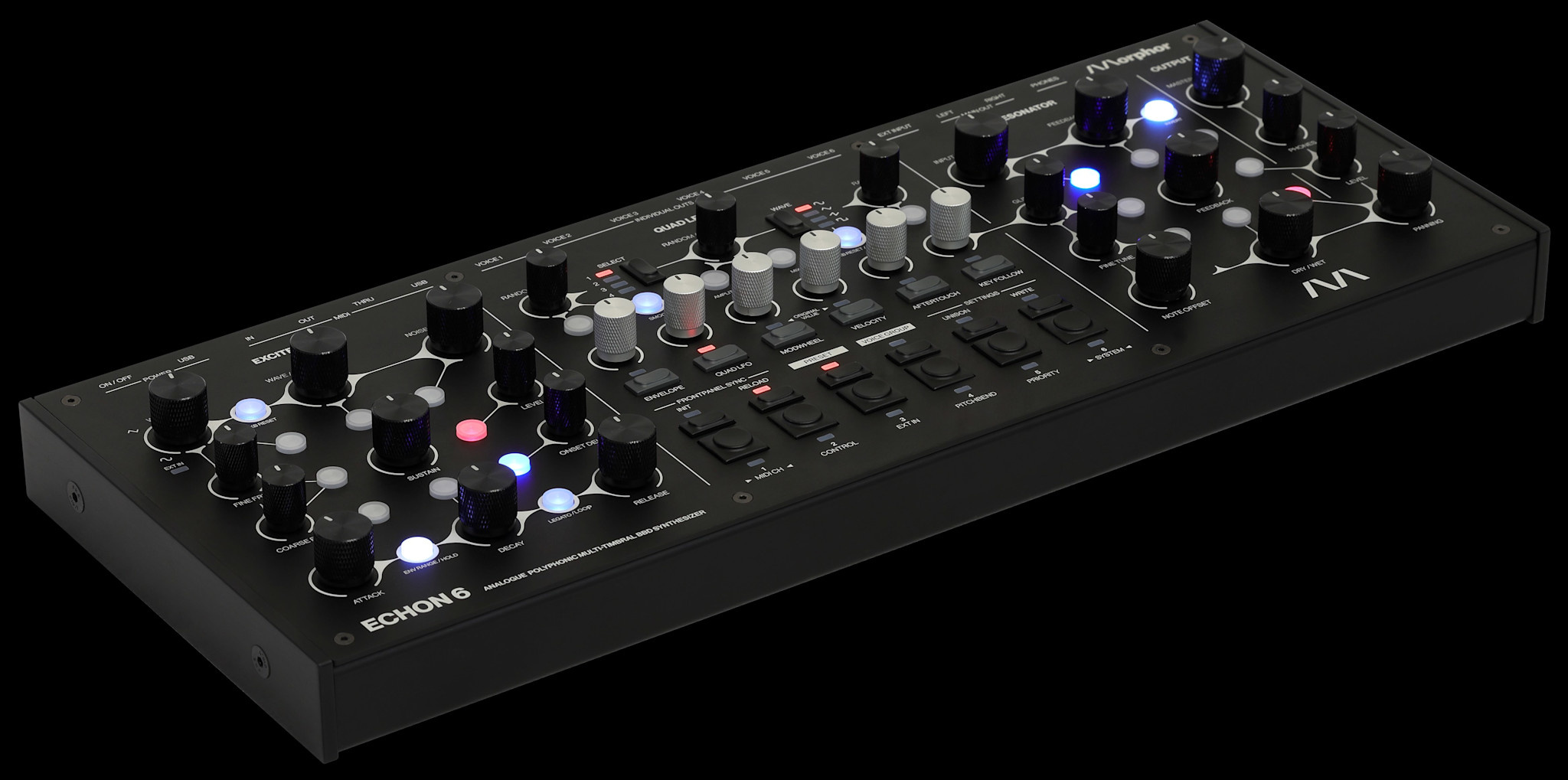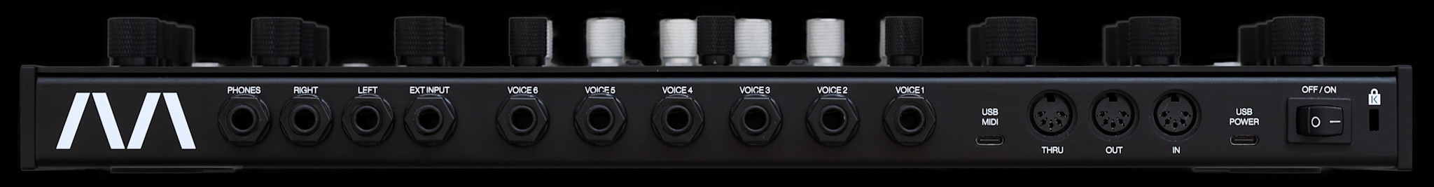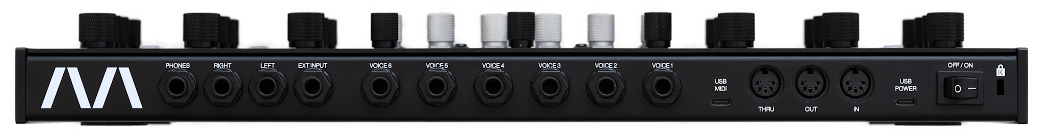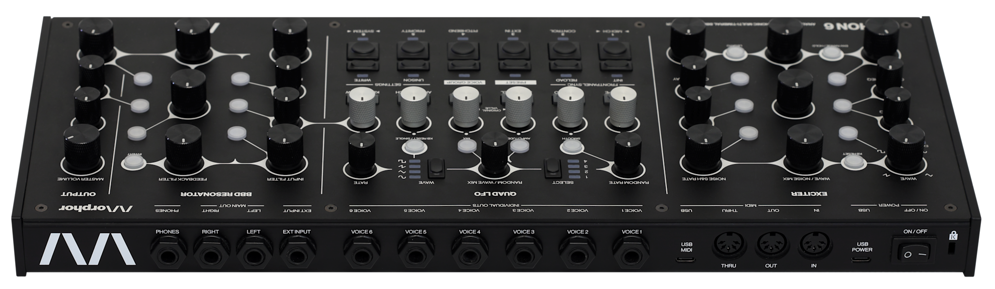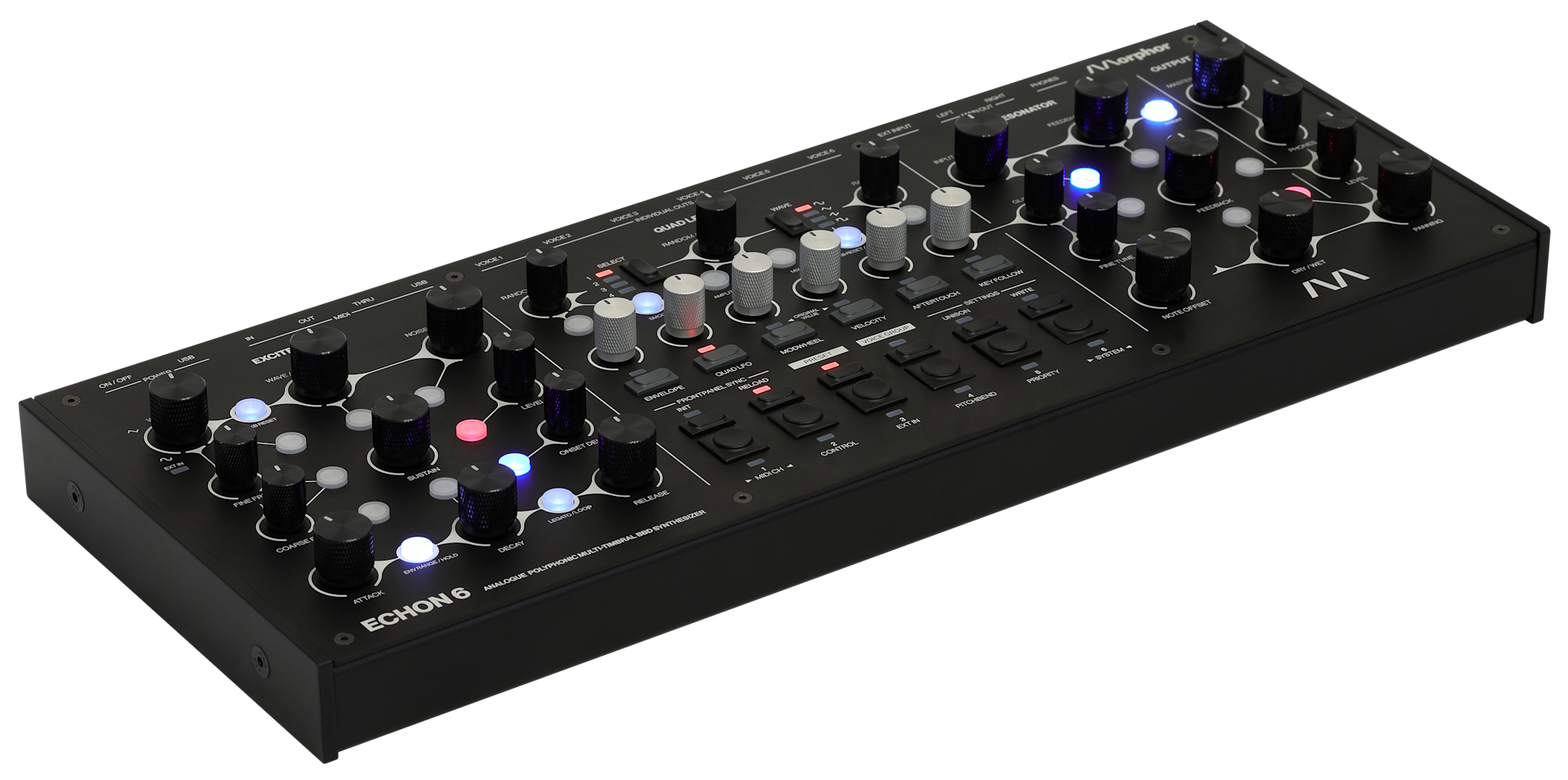 Its voice grouping and unison modes push ECHON 6 beyond the traditional polyphonic configuration into layered, multi-timbral and personally optimised setups. With its six independent stereo voice outputs, full MIDI control, and a rugged aluminum enclosure ready for tabletop, 19″ rack, or VESA mounting, ECHON 6 is built for both stage and studio. It is a fully tactile instrument — no display, no menus, no distractions — inviting musicians to play, perform, and explore sound through pure hands-on control.