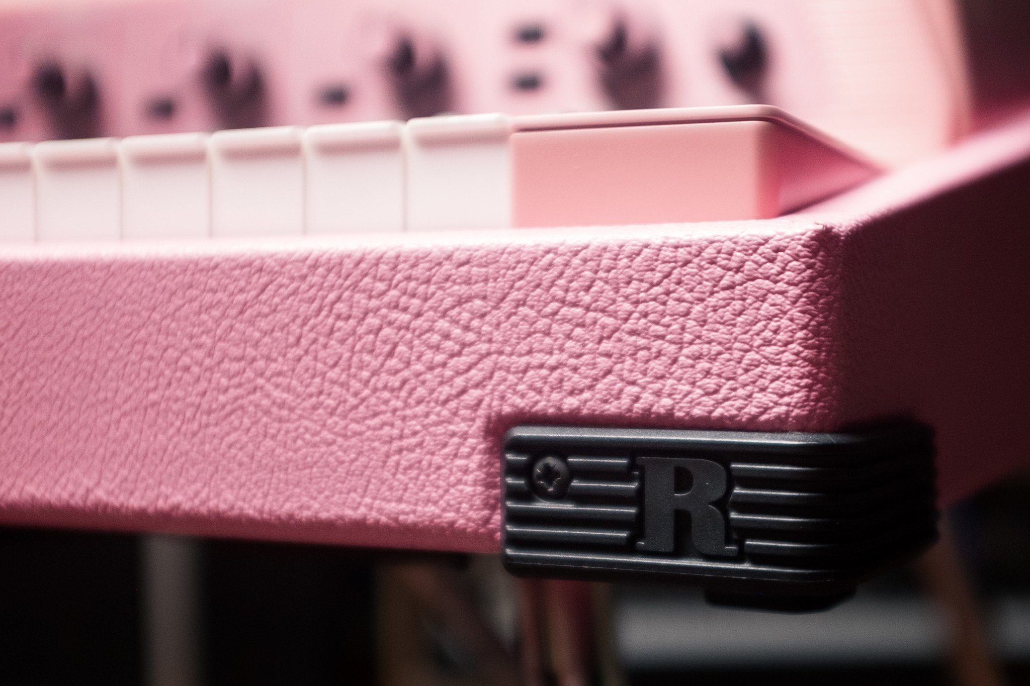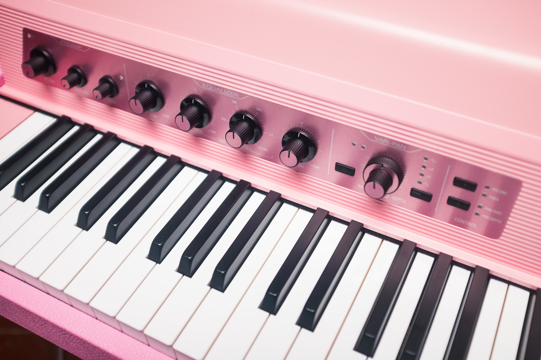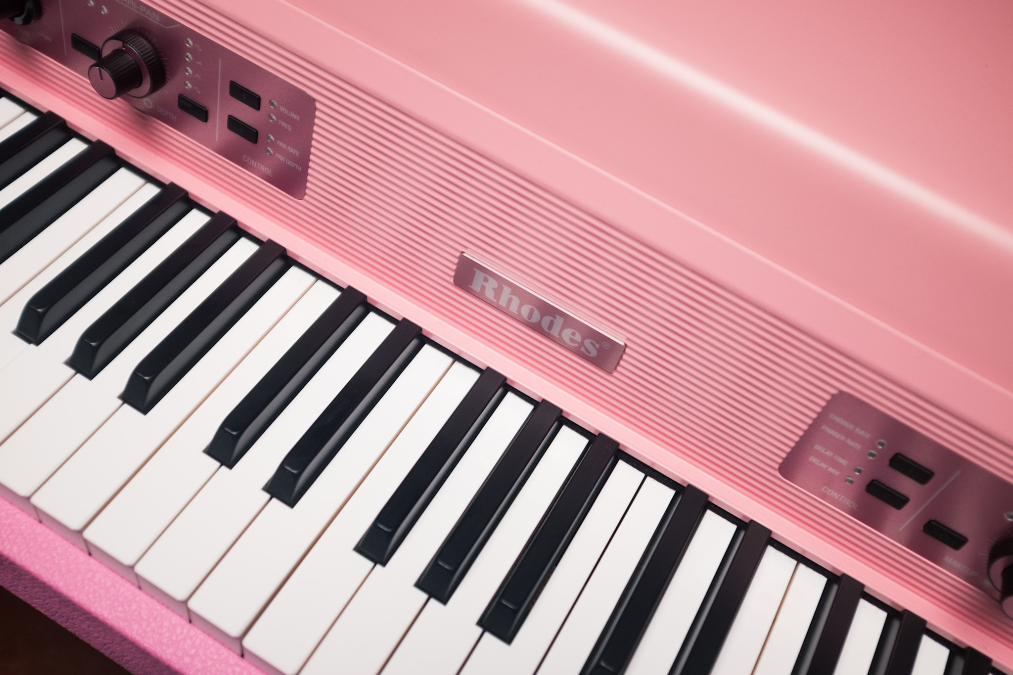 silver-on-rose-pink logo plates and colour-matched sustain pedal with matching footplate,