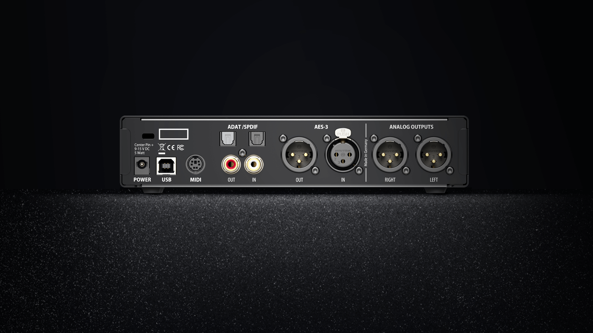 The comprehensive set of digital I/Os, centered around an AES/EBU input and output via XLR, also includes SPDIF coax, SPDIF optical or 8-channel ADAT. All I/Os can be used simultaneously, turning the unit into a swiss army knife interface that receives and sends all common digital audio formats. An integrated SRC (Sample Rate Converter) can be switched to one of the three inputs to solve clocking issues and to adapt to other sample rates. This allows, for example, the device to be AES clock-synchronized from the main source and to listen to SPDIF independently at the same time. MIDI I/O via an included breakout cable completes the package.