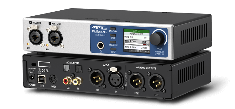 On the back of the Digiface AES there are 2 balanced analog outputs via XLR male to drive power amps, active monitor speakers, or recordings. The headphone output allows additional and independent high quality monitoring, providing sufficient output power and volume on high and low impedance headphones.