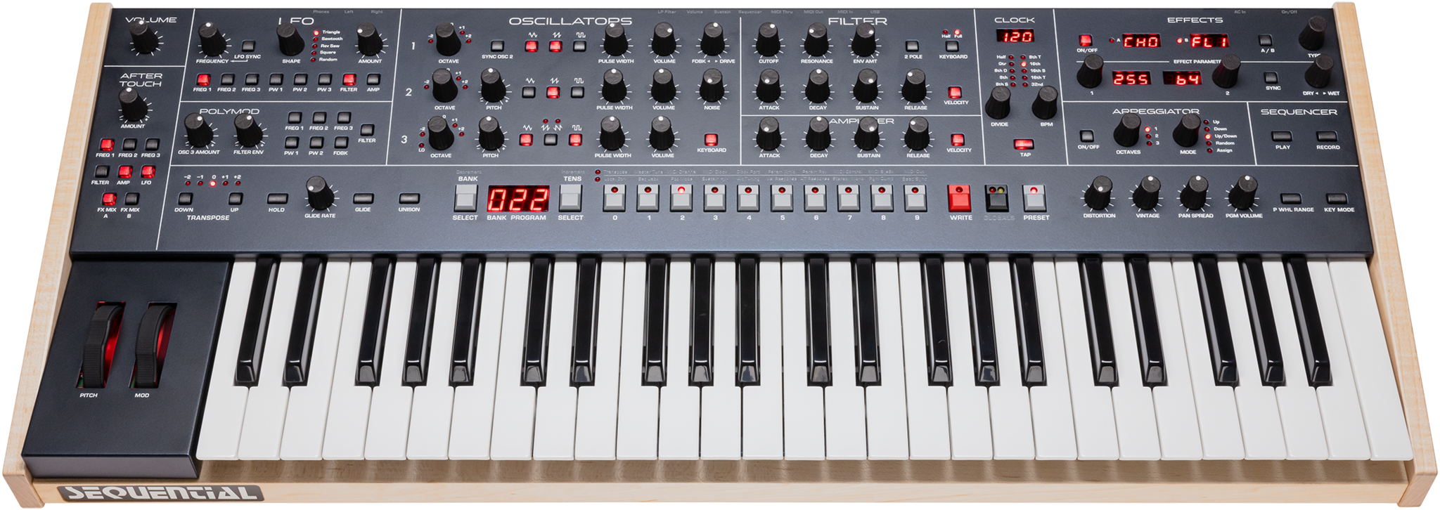 Naturally, the Trigon-6 has the full complement of Sequential’s ”must-have” sound-sculpting features including super snappy envelopes, a syncable LFO with multiple waveforms and destinations, a polyphonic step sequencer, and an arpeggiator. Best of all, the knob-per-function front panel of the Trigon-6 puts these conttrols at your fingertips. And the ready-made palette of 500 factory and 500 user presets provides classic basses, leads, and pads to jump start any project.
