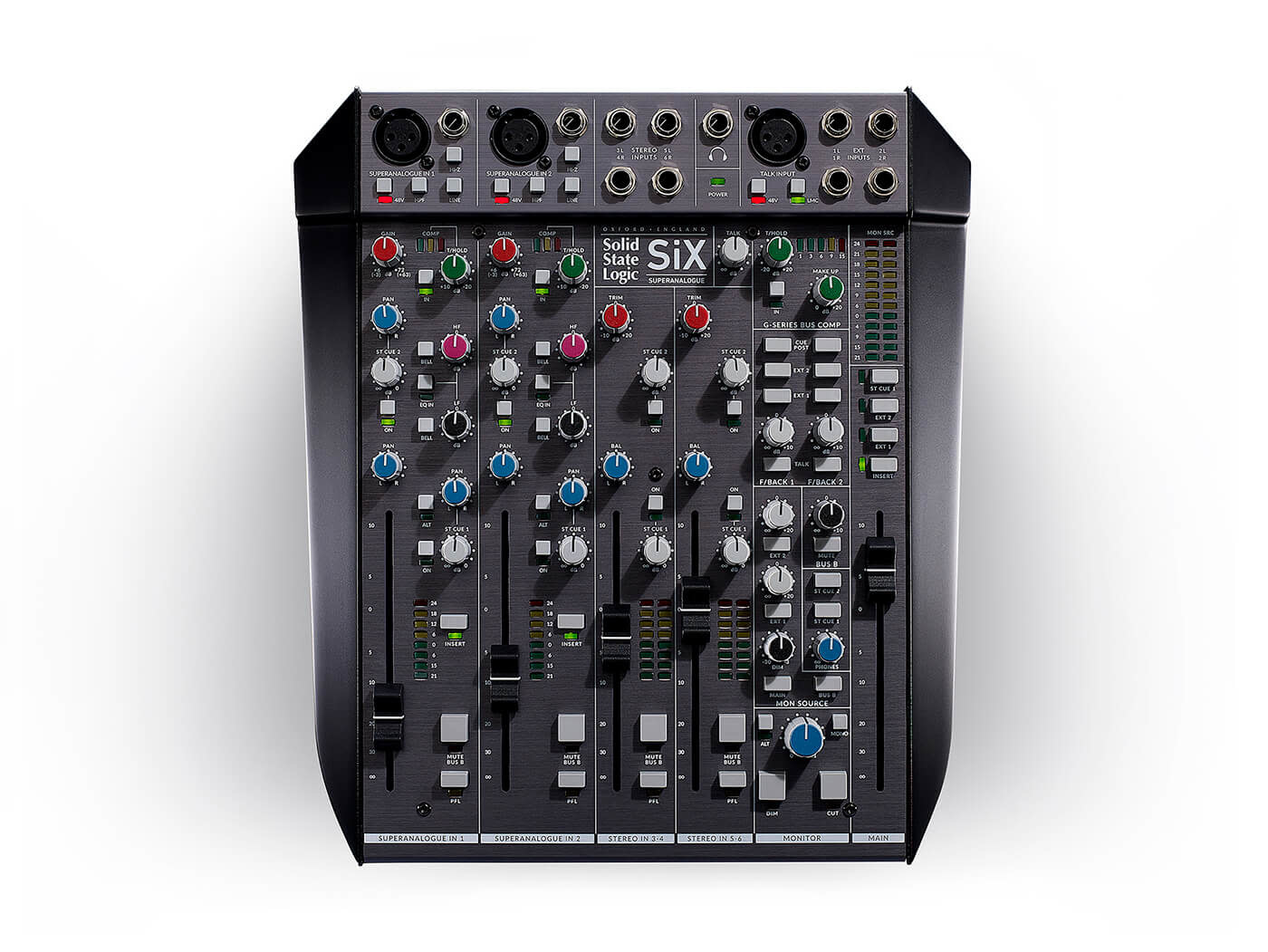 SiX is a condensed professional console for use in the studio, in post-production, on stage, and for podcasting. SiX offers big console sound and an impressive set of utility features in a format that is small enough to stick in a bag a go wherever you need it. SiX is stunning value; it offers two recording channels with SuperAnalogueTM mic pres, two band EQ, an essential one knob version of the classic SSL Channel Compressor, a new two-band Channel EQ, inserts and 100mm faders. There is a two-knob version of the legendary G-Series Bus Compressor on the main mix bus and the unique Listen Mic Compressor on the Talkback. In mixdown mode it is a very capable twelve channel summing system that offers analogue detail, depth and width to your mixes.
