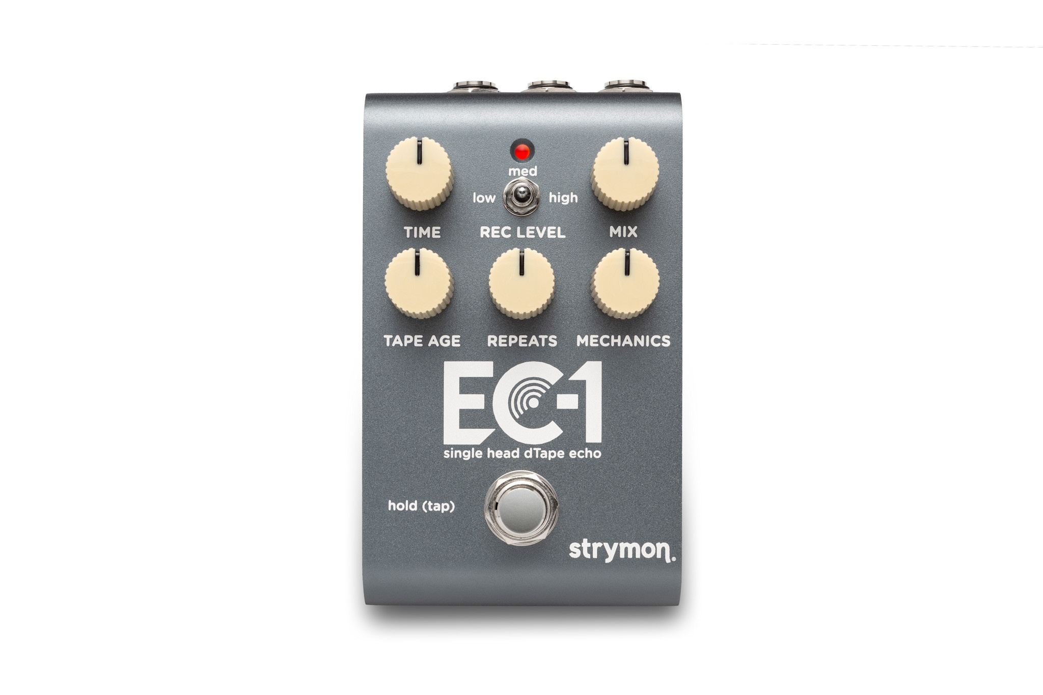 from thinner to fatter, EC-1’s three-way Record Level toggle switch selects the gain of the signal fed into the virtual record head. Choose the low position for unity gain with optimized bias for the cleanest repeats, medium for a 6dB input signal boost with increased bias for slightly saturated repeats, or high for a 12dB input signal boost with further increased bias for heavily saturated repeats. This control also gives you