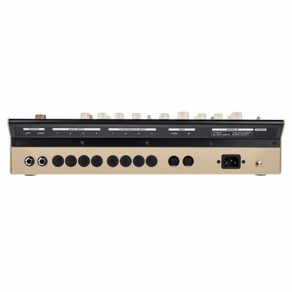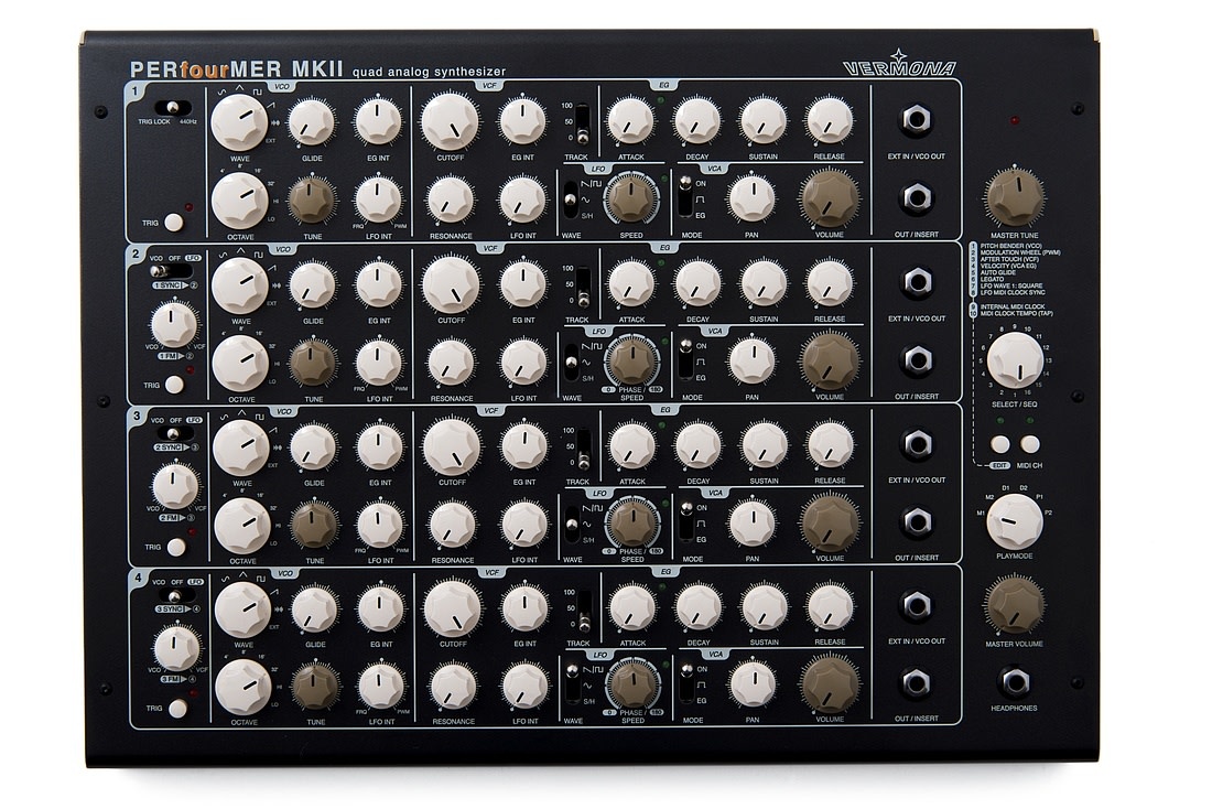 Combines four discrete monophonic analogue synthesiser into one synth (arbitrary combinations possible)